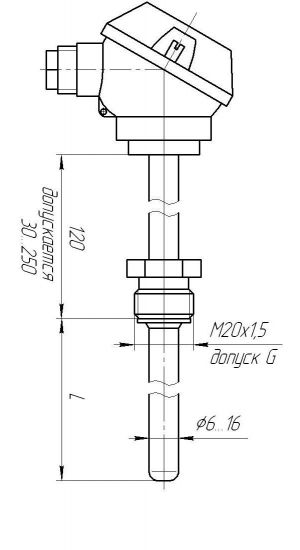 Диапазон измерений -196...+600 °С. Тип защитной арматуры — кабель RTD в стальной оболочке (12Х18Н10Т). Диаметр арматуры 8 или 10мм. Материал клеммной головки — алюминиевый сплав, размер 65х52мм.
