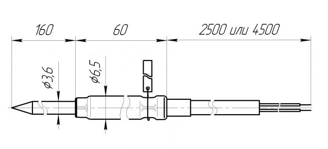 Датчик без корпуса, защитная арматура в виде иглы 3,6 мм, материал — сталь 12Х18Н10Т. Кабель — проволока термоэлектродная 0,5 мм с фторопластовой изоляцией и наружной оболочкой из фторопластовой трубки длиной 2500 мм. Условное давление измеряемой среды Ру=0,4 Па. |