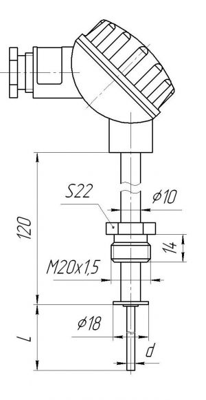 Материал головки — термостойкая пластмасса. Защитная арматура Ø10 мм, штуцер подвижный М20х1,5 и утонением 8х60 мм. Рабочий спай изолирован. Условное давление измеряемой среды Ру=6,3МПа. Один чувствительный элемент. |