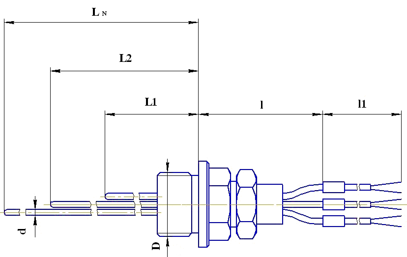 Подключение к процессу с помощью линзового крепления. Рабочий спай каждой зоны измерения один, изолирован от защитной оболочки. Диаметр оболочки кабеля d=1,5...6 мм. Термопарный кабель в минеральной изоляции с оболочкой из стали 12Х18Н10Т (AISI 321). Длина L1 от 250 мм до LN 40000 мм. Герметичны к измеряемой среде (Ру=1,0 МПа). |