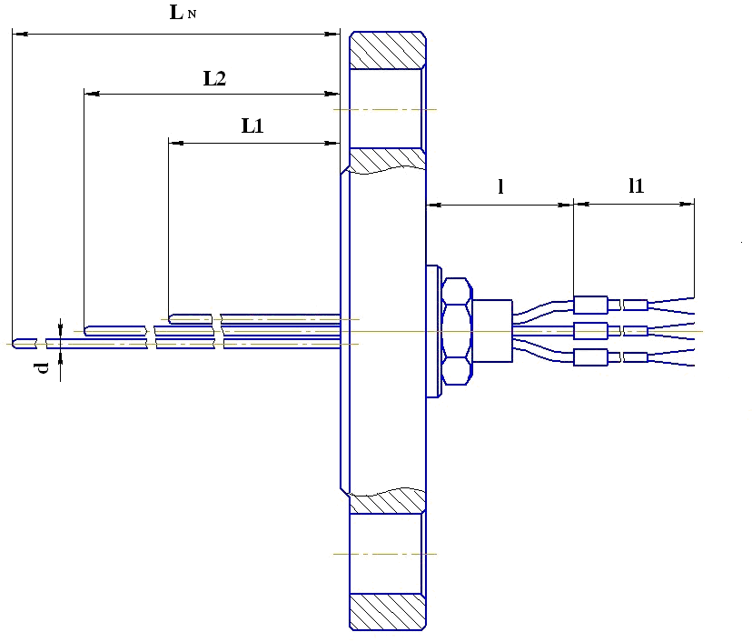 Подключение к процессу с помощью фланца по ГОСТ 12815-80. Рабочий спай каждой зоны измерения один, изолирован от защитной оболочки. Диаметр оболочки кабеля d=1,5...6 мм. Термопарный кабель в минеральной изоляции с оболочкой из стали 12Х18Н10Т (AISI 321). Длина L1 от 250 мм до LN 40000 мм. Герметичны к измеряемой среде (Ру=1,0 МПа). |