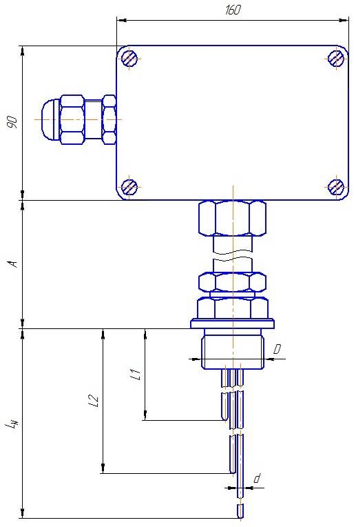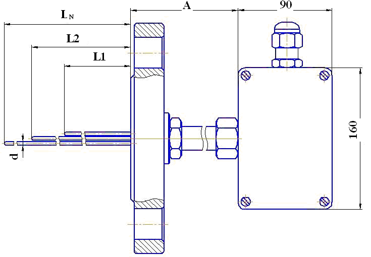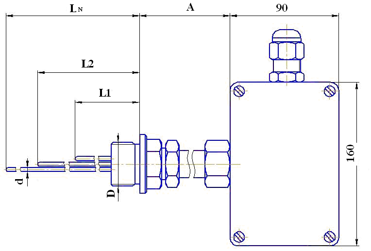 Клемная коробка (160х160х90 мм) из алюминиевого сплава, подключение к процессу с помощью штуцера. Рабочий спай каждой зоны измерения один, изолирован от защитной оболочки. Диаметр оболочки кабеля d=1,5...6 мм.
