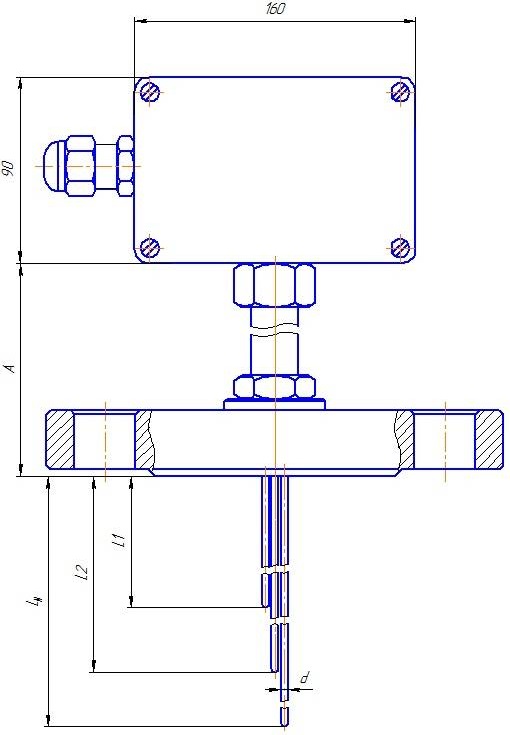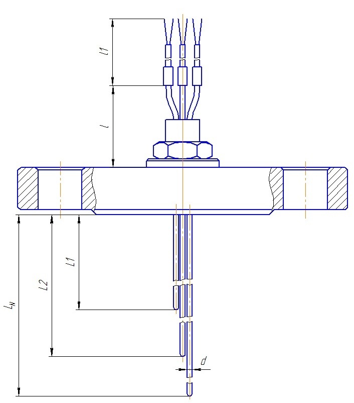 Подключение к процессу с помощью фланца по ГОСТ 12815-80. Рабочий спай каждой зоны измерения один, изолирован от защитной оболочки. Диаметр оболочки кабеля d=1,5...6 мм. Термопарный кабель в минеральной изоляции с оболочкой из стали 12Х18Н10Т (AISI 321). Длина L1 от 250 мм до LN 40000 мм. Герметичны к измеряемой среде (Ру=1,0 МПа). |