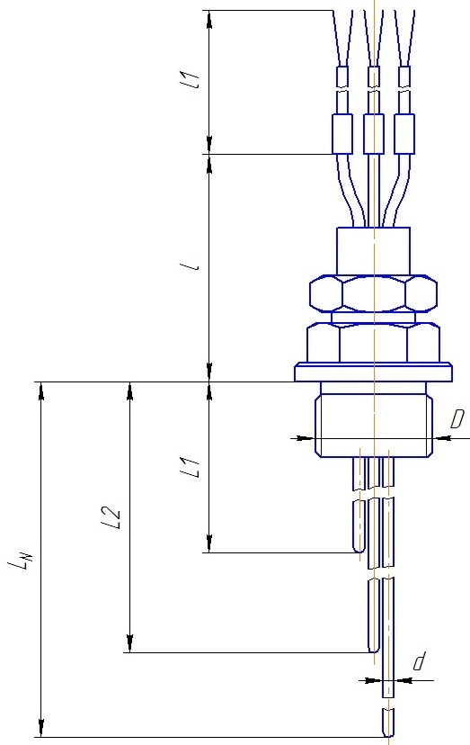 Подключение к процессу с помощью линзового крепления. Рабочий спай каждой зоны измерения один, изолирован от защитной оболочки. Диаметр оболочки кабеля d=1,5...6 мм. Термопарный кабель в минеральной изоляции с оболочкой из стали 12Х18Н10Т (AISI 321). Длина L1 от 250 мм до LN 40000 мм. Герметичны к измеряемой среде (Ру=1,0 МПа). |
